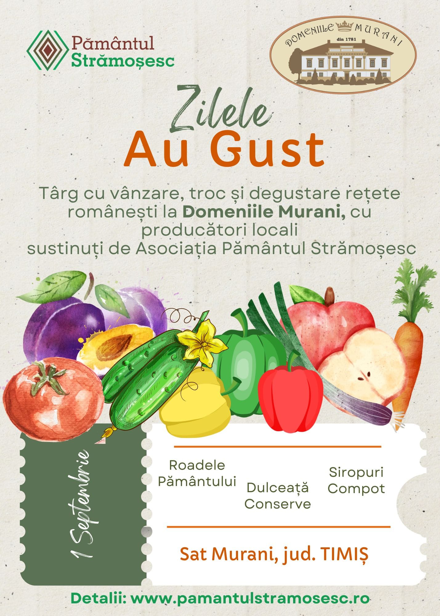 Pământul Strămoșesc invită micii producători la Târgul “Zilele Au Gust” de la Domeniile Murani, jud. Timiș