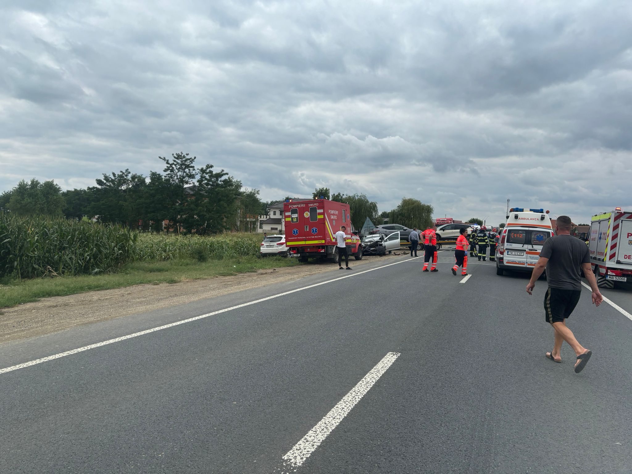 Accident grav cu trei autoturisme la Belinț: O victimă încarcerată salvată cu elicopterul SMURD (FOTO)